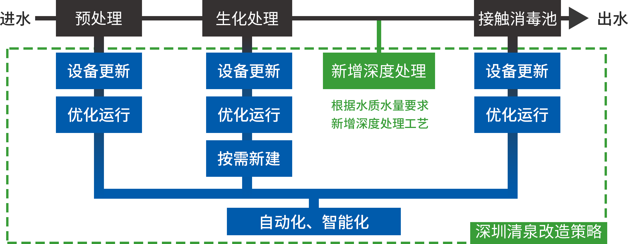 深圳清泉提出优化现有活性污泥法工艺,强化二级生化脱氮除磷效果,并根据实际进出水水质情况,采用上向流反硝化滤池、无堵塞曝气生物滤池、高效沉淀池等技术进行灵活组合或单独使用,可使用土建模式或应用模块化装备,形成完整的飞禽走兽游戏机的解决方案,为客户实现达标排放、绿色低碳的目标。