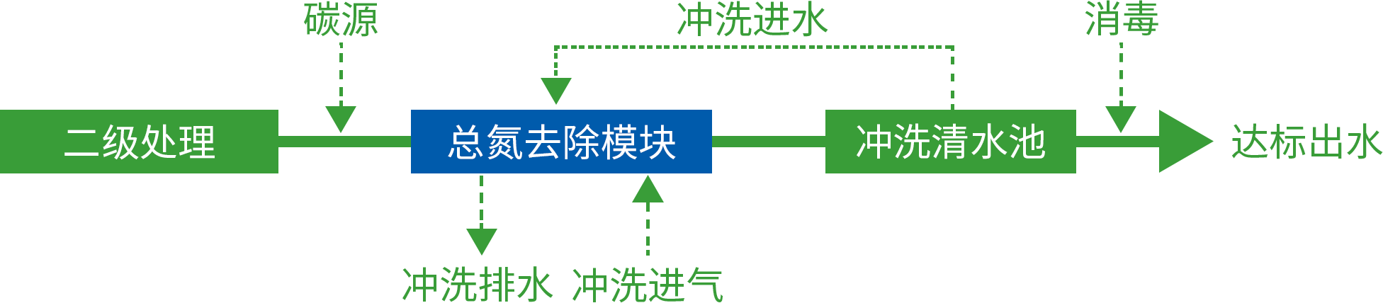 该模块的技术原理是以滤料表面附着的反硝化菌以有机碳源作为电子供体,以硝酸盐或亚硝酸盐作为电子受体,将其还原成氮气,从而去除污水中的tn。