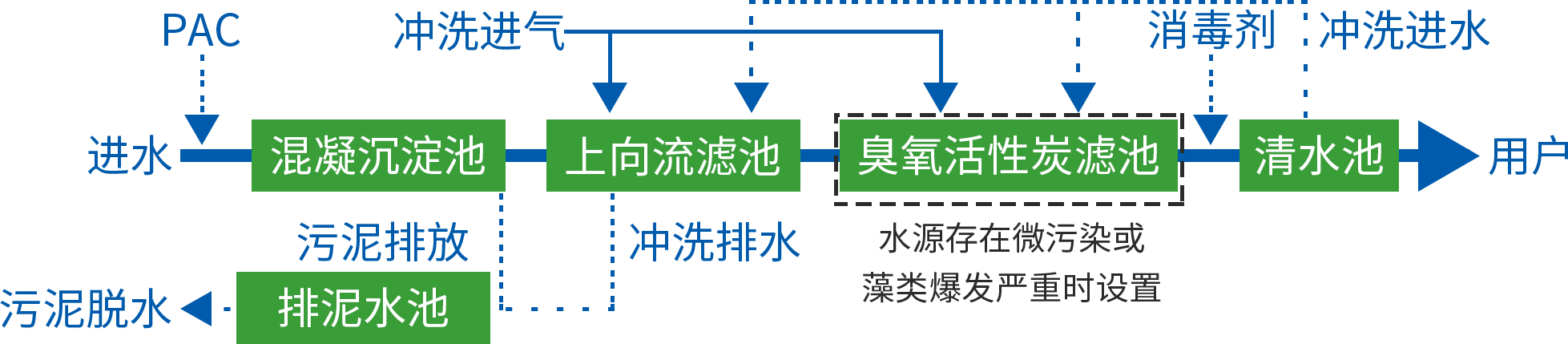 深圳清泉采用“沉淀池 气水冲洗滤池 消毒”,运行成本低,产水安全可靠;若水源存在微污染或藻类爆发严重,可在气水冲洗滤池后增设臭氧活性炭滤池进行深度处理,进一步保障饮用水安全。